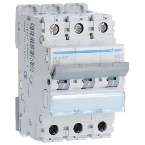Nombre de pôles: 3P. Courbe: C. Intensité: 32A. Tension Ue: 400V. Pouvoir de coupure: 6kA.