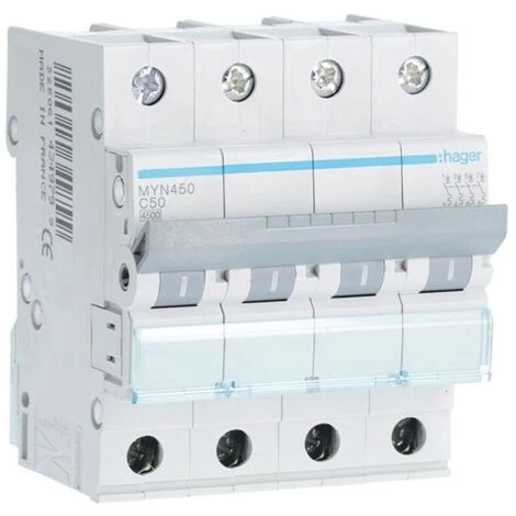 Interrupteur magnétothermique Hager 4P 50A 4,5KA C 4 moduli MYN450